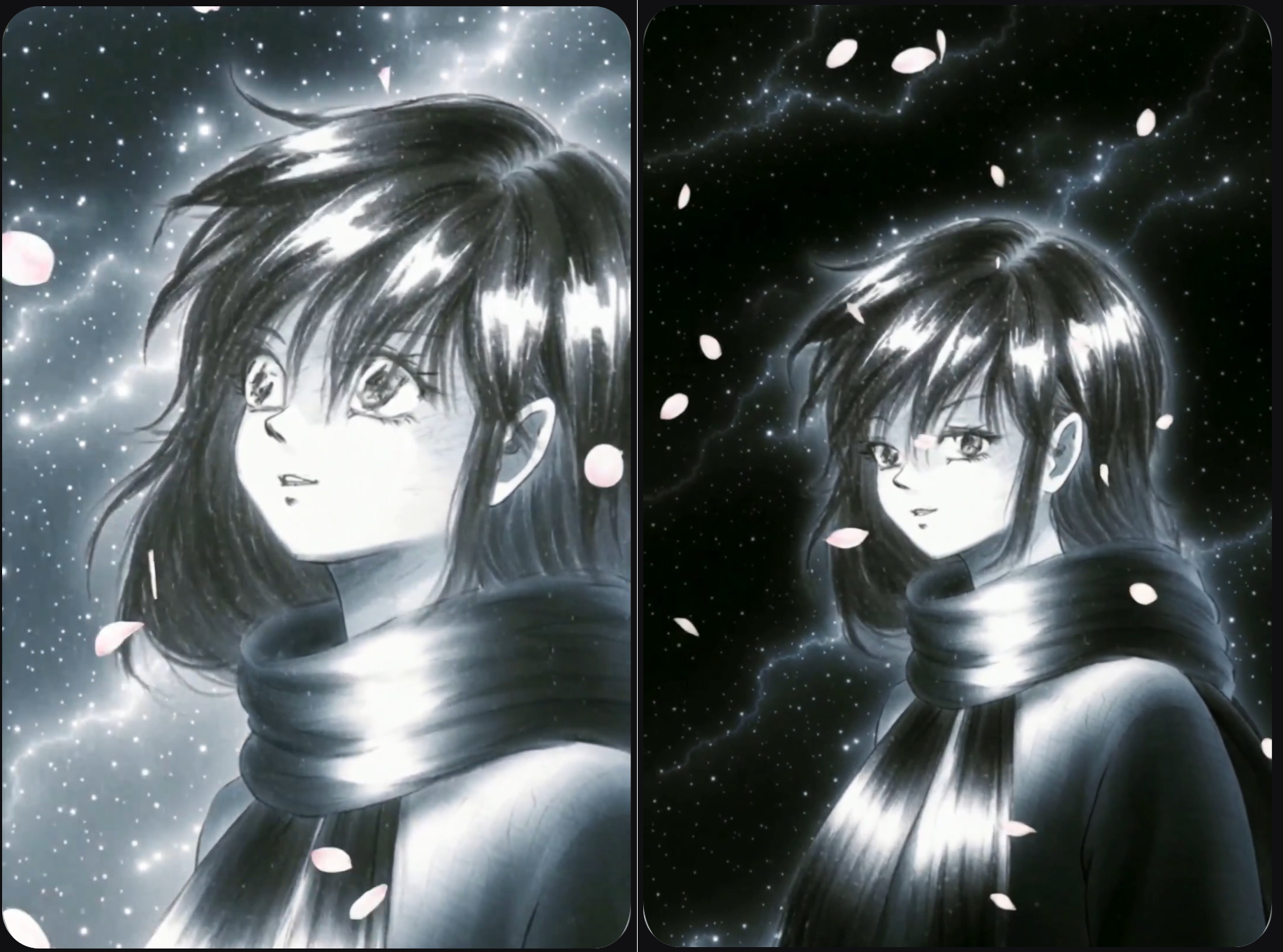 花弁が舞う中、視点が引いてゆくと共に、見えてくる星空が綺麗です。