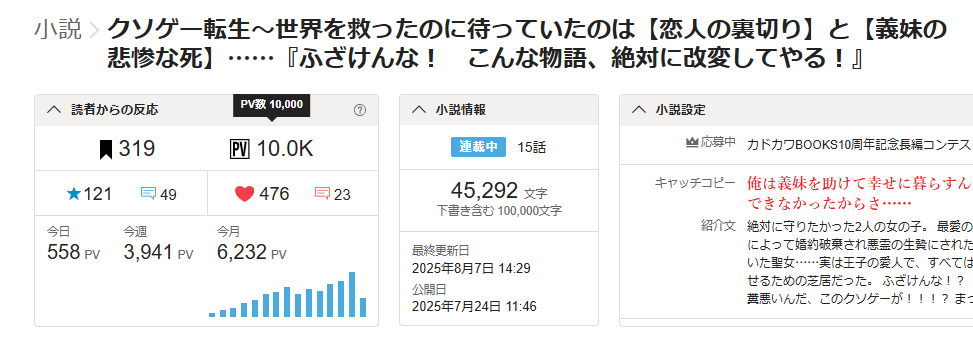 https://kakuyomu.jp/works/16818792435762756841楽しく書いていて、投稿予約をして管理画面に戻ってきたら、ちょうど9,999PV。