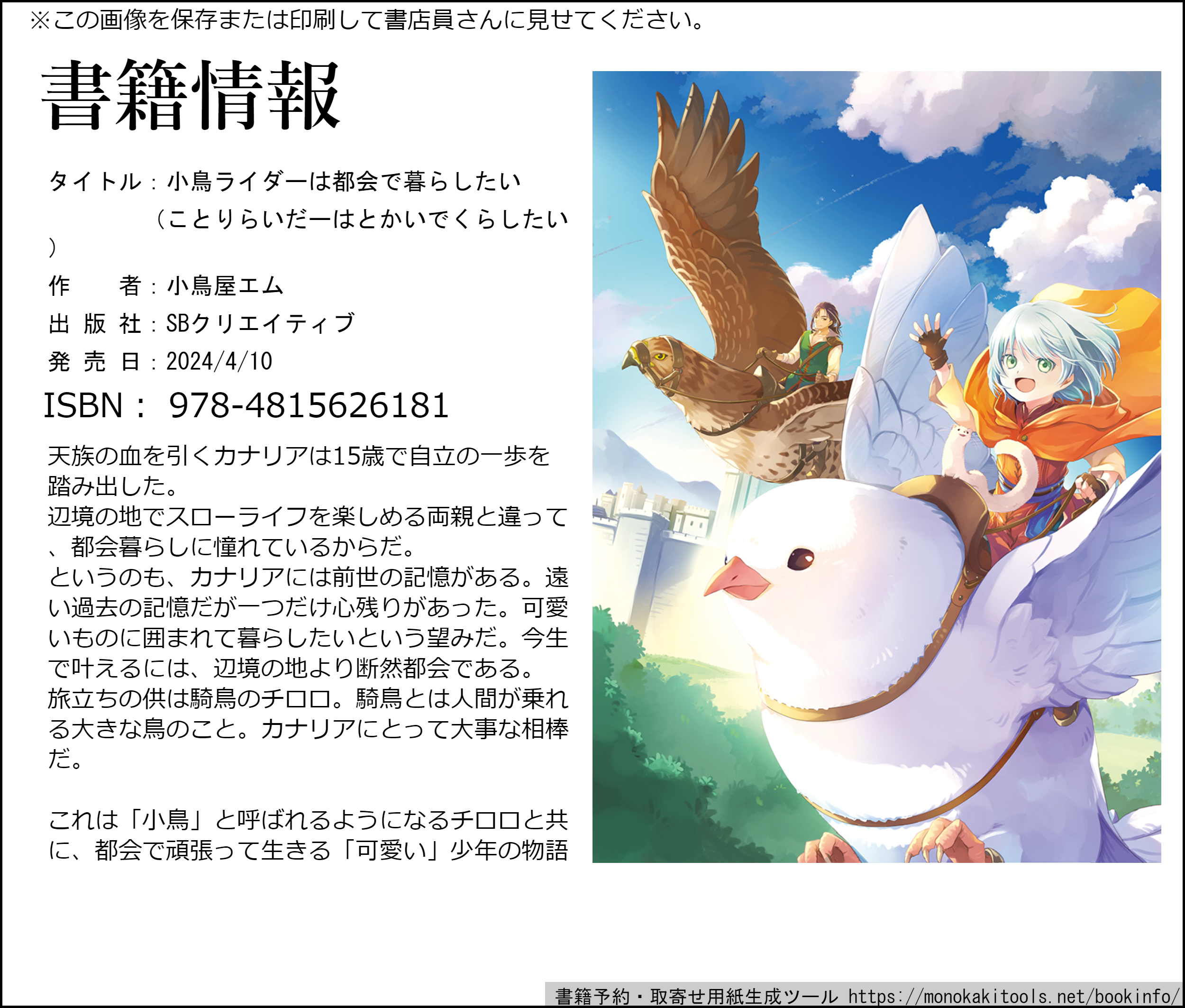 カクヨムで連載中の「小鳥ライダーは都会で暮らしたい」が4月10日に出ます!