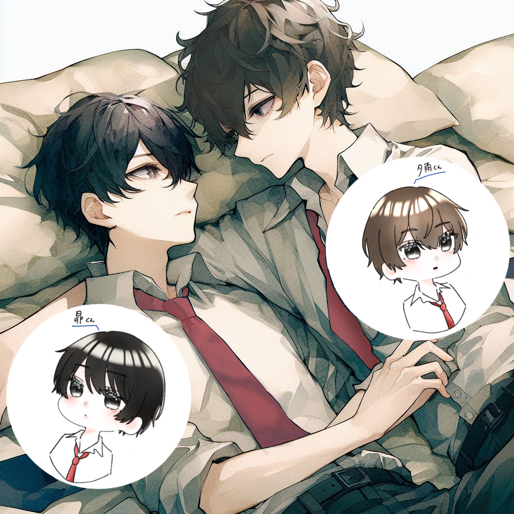 添付イラストの白い円のなかのかわいいふたりが鳴宮さまから頂いたイラストです。透明感があって生意気そうでめちゃくちゃかわいい…!!