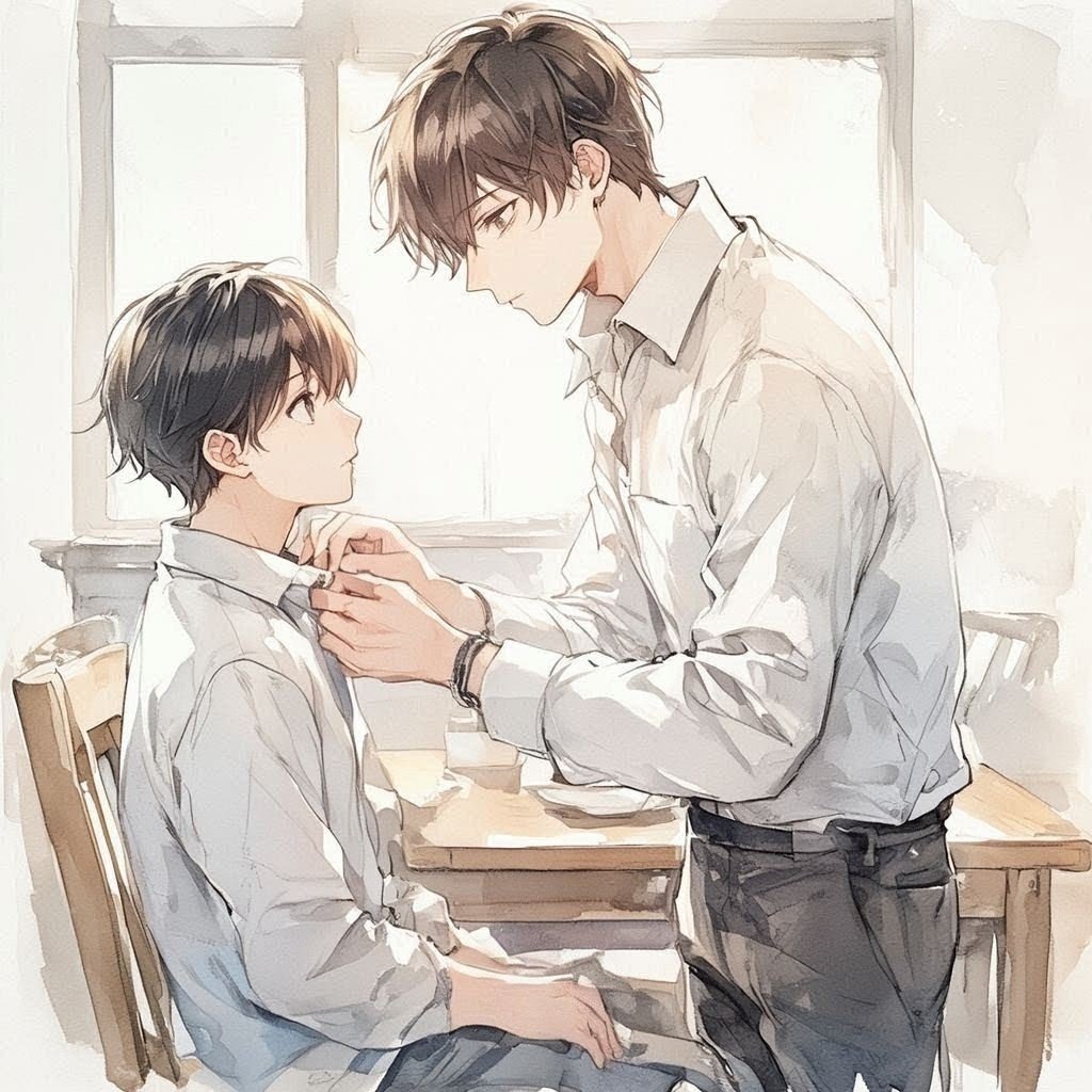 アニメスタイルのイラスト。真剣。スタイリッシュで緻密。柔らかい水彩画とGlazingの質感。淡く明るい。 朝のダイニング。白い長袖のワイシャツ姿の兄、焦茶の髪、切れ長の瞳、29歳。15歳の弟、椅子に向き合って座り、弟は兄にボタンをとめてもらう。