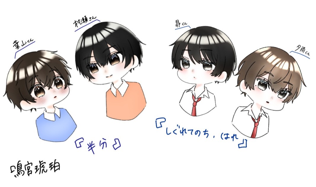 なお、『しぐれてのち、はれ』の夕雨&時雨パパの髪が柔らかくって茶色、と作品で表現しましたが、こちらのイラストから頂いちゃいました(*´艸`*)イメージピッタリ