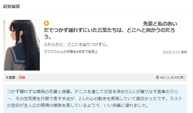作品は「先輩と私のあいだでつかず離れずにいた言葉たちは、どこへと向かうのだろう。」です。いったい今年の素人マ猫はどうなってるんでしょう?でもみなさまの応援のおかげでしかありません。本当にありがとうございます。