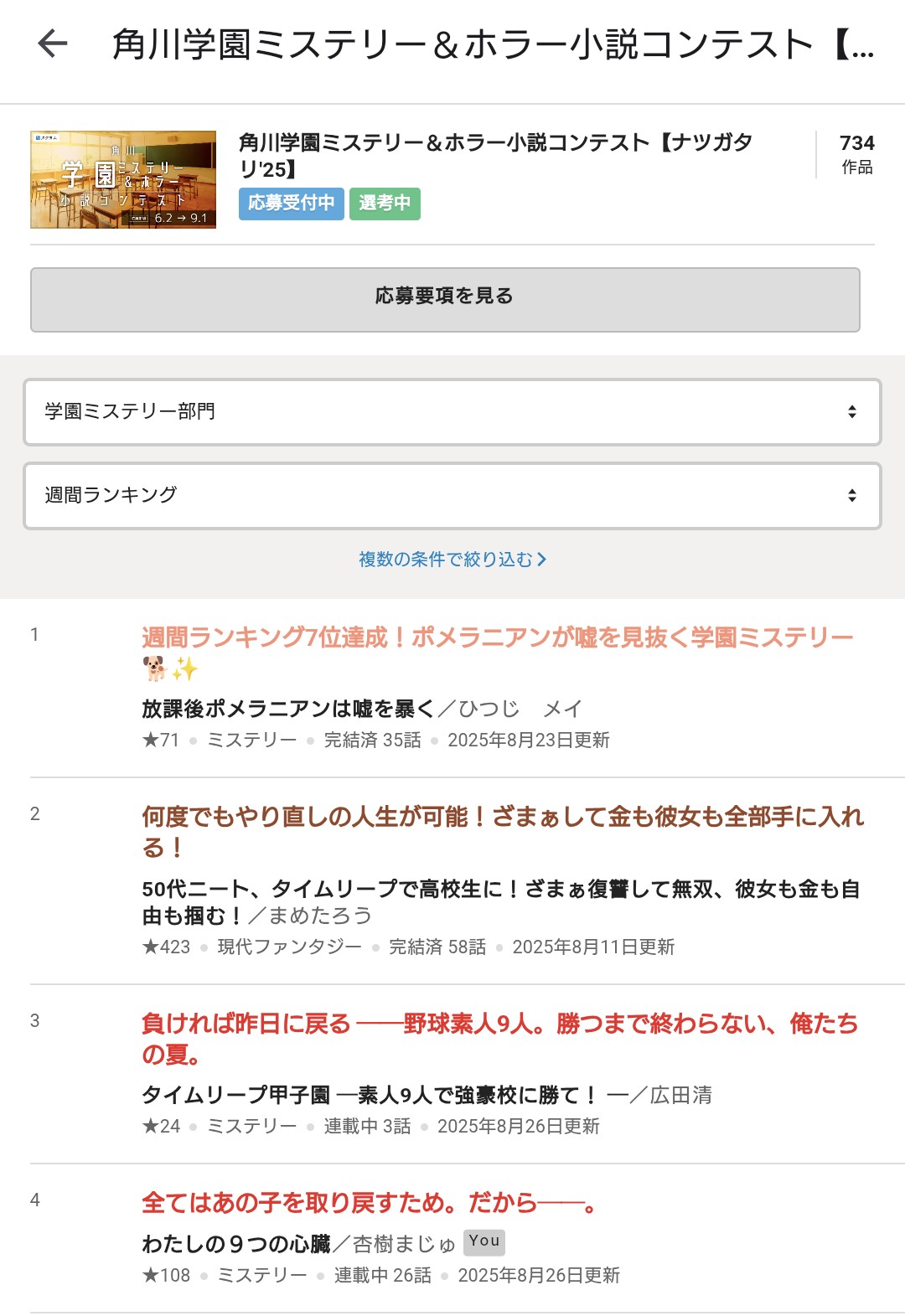 ナツガタリ・学園総合11位、ミステリー部門4位