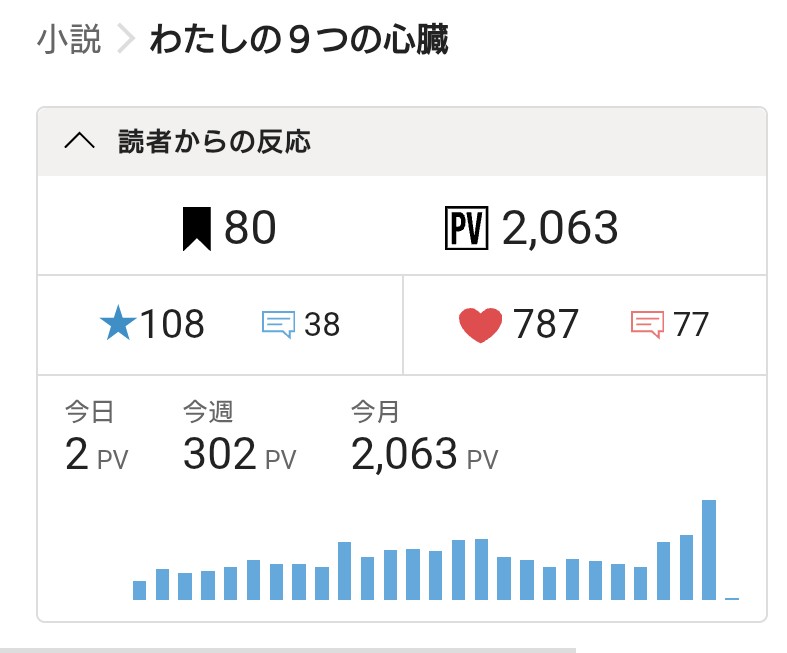 さて、拙作「わたしの9つの心臓」が☆100&2000PVを突破いたしましたので、報告させていただきます。