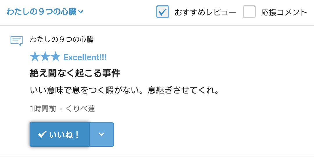 さて、拙作「わたしの9つの心臓」に☆・レビューをいただきましたので、お礼の報告をさせていただきます。