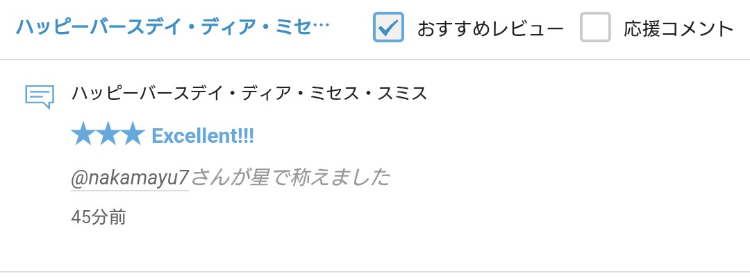 さて、拙作「ハッピーバースデイ・ディア・ミセス・スミス」に☆をいただきましたので、お礼の報告をさせていただきます。