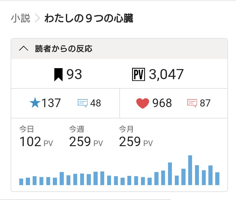 さて、拙作「わたしの9つの心臓」が3000PVを突破いたしましたので、報告させていただきます。