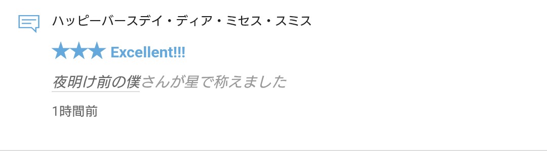 さて、拙作「ハッピーバースデイ・ディア・ミセス・スミス」に☆をいただきましたので、お礼の報告をさせていただきます。