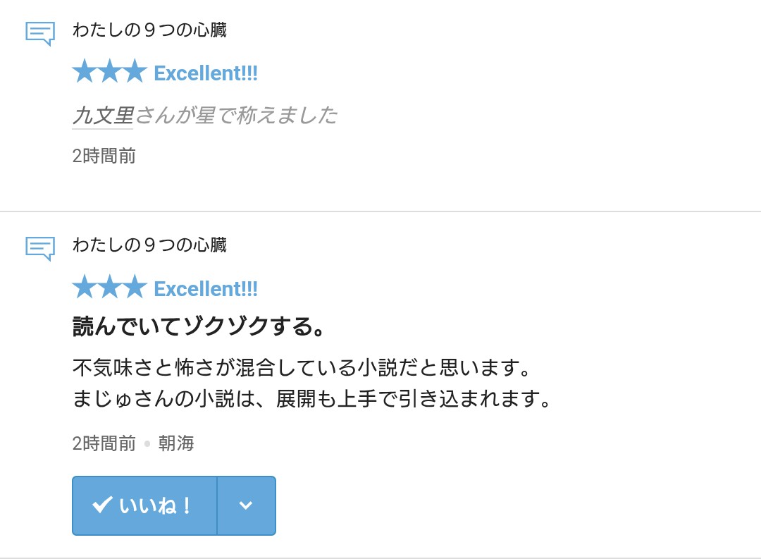 さて、拙作「わたしの9つの心臓」に☆・レビューをいただきましたので、お礼の報告をさせていただきます。