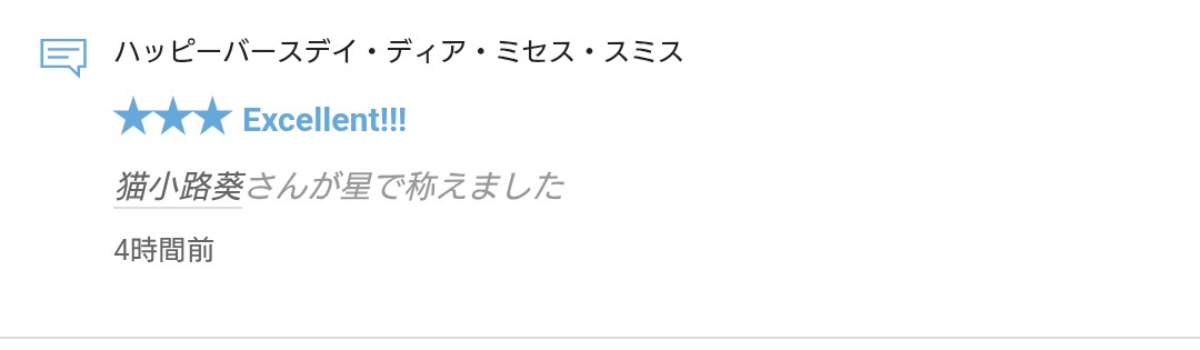 さて、拙作「ハッピーバースデイ・ディア・ミセス・スミス」に☆をいただきましたので、お礼の報告をさせていただきます。