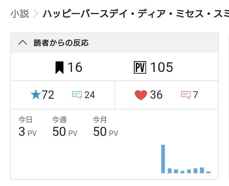 さて、拙作「ハッピーバースデイ・ディア・ミセス・スミス」が100PVを突破いたしましたので、報告させていただきます。