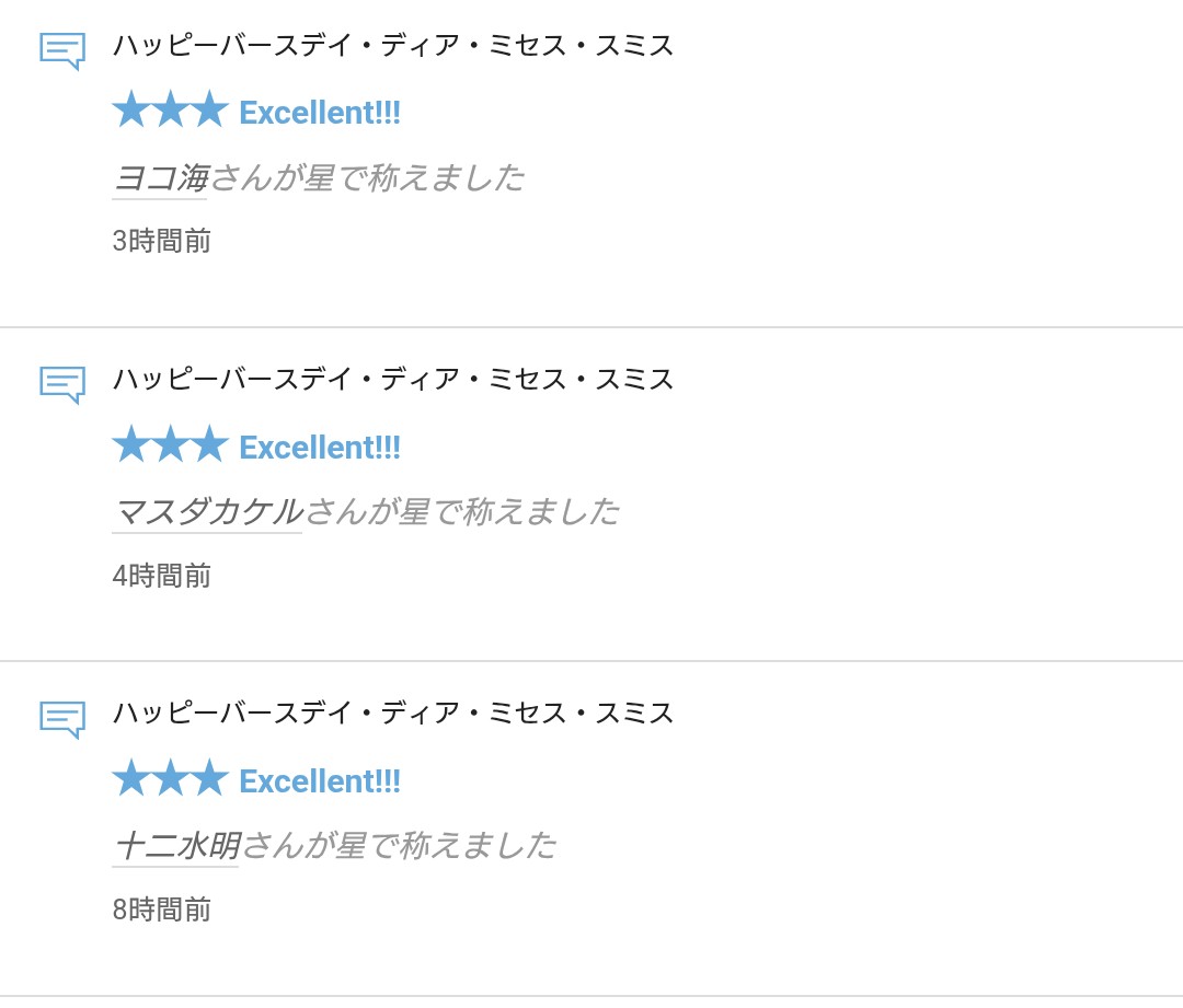 さて、拙作「ハッピーバースデイ・ディア・ミセス・スミス」に☆をいただきましたので、お礼の報告をさせていただきます。