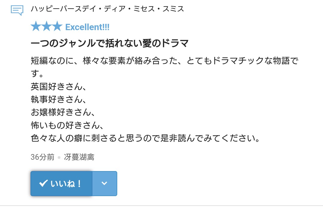 さて、拙作「ハッピーバースデイ・ディア・ミセス・スミス」に☆・レビューをいただきましたので、お礼の報告をさせていただきます。