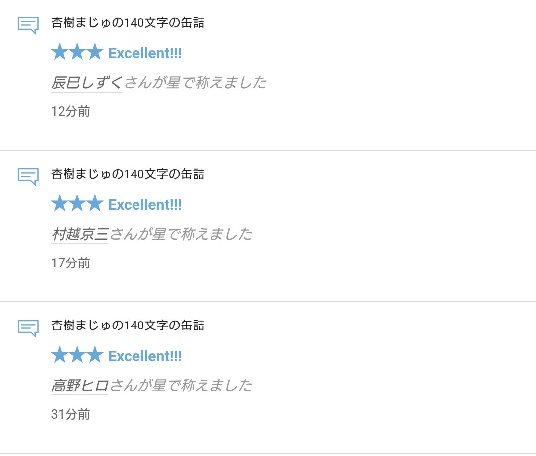 さて、拙作「杏樹まじゅの140文字の缶詰」に☆をいただきましたので、お礼の報告をさせていただきます。