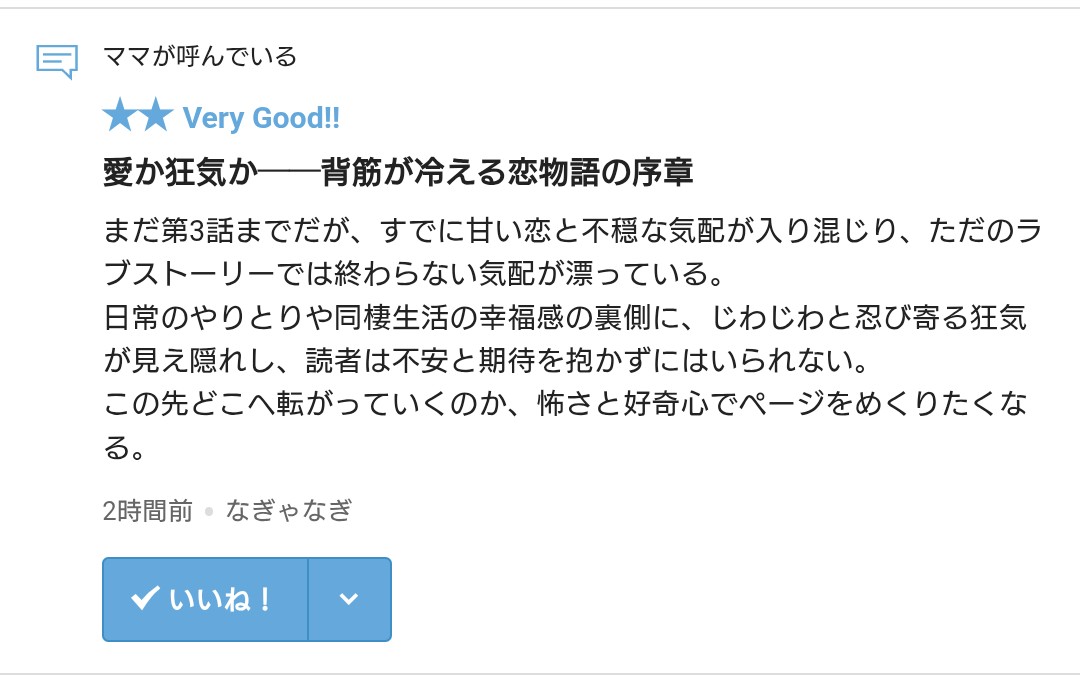 さて、拙作「ママが呼んでいる」に☆・レビューをいただきましたので、お礼の報告をさせていただきます。