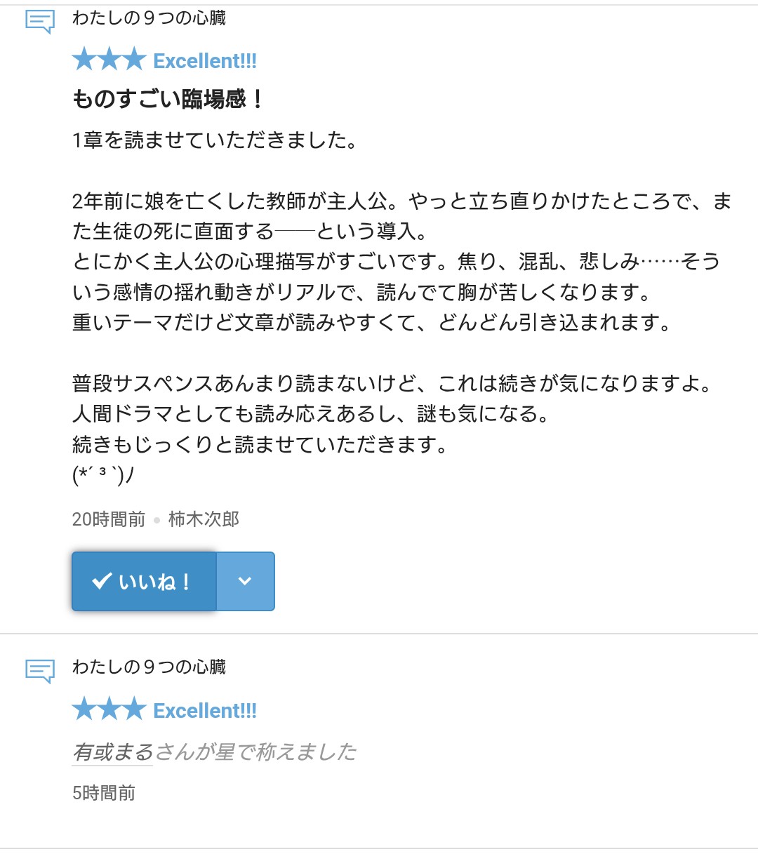 さて、拙作「わたしの9つの心臓」に☆・レビューをいただきましたので、お礼の報告をさせていただきます。