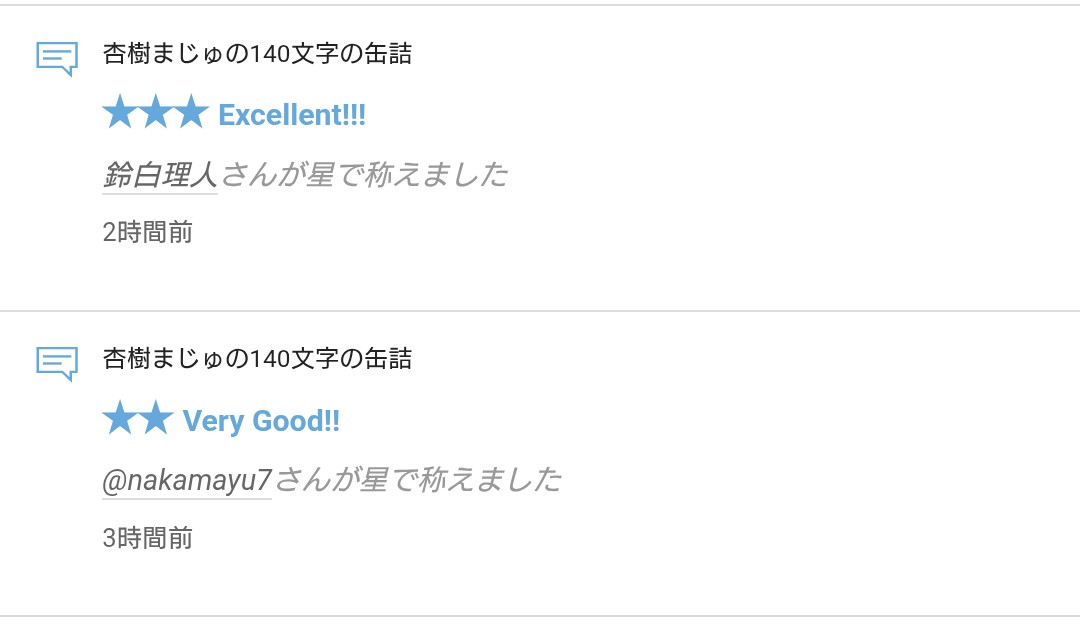 さて、拙作「杏樹まじゅの140文字の缶詰」に☆をいただきましたので、お礼の報告をさせていただきます。
