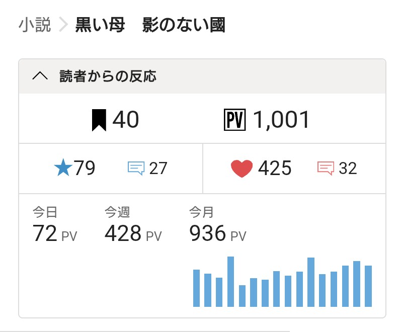 さて、拙作「黒い母 影のない國」が1000PVを突破いたしましたので、報告させていただきます。