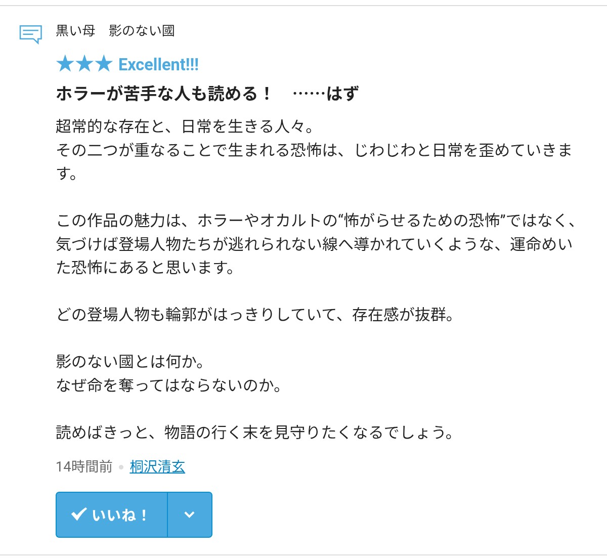 さて、拙作「黒い母 影のない國」に☆・レビューをいただきましたので、お礼の報告をさせていただきます。