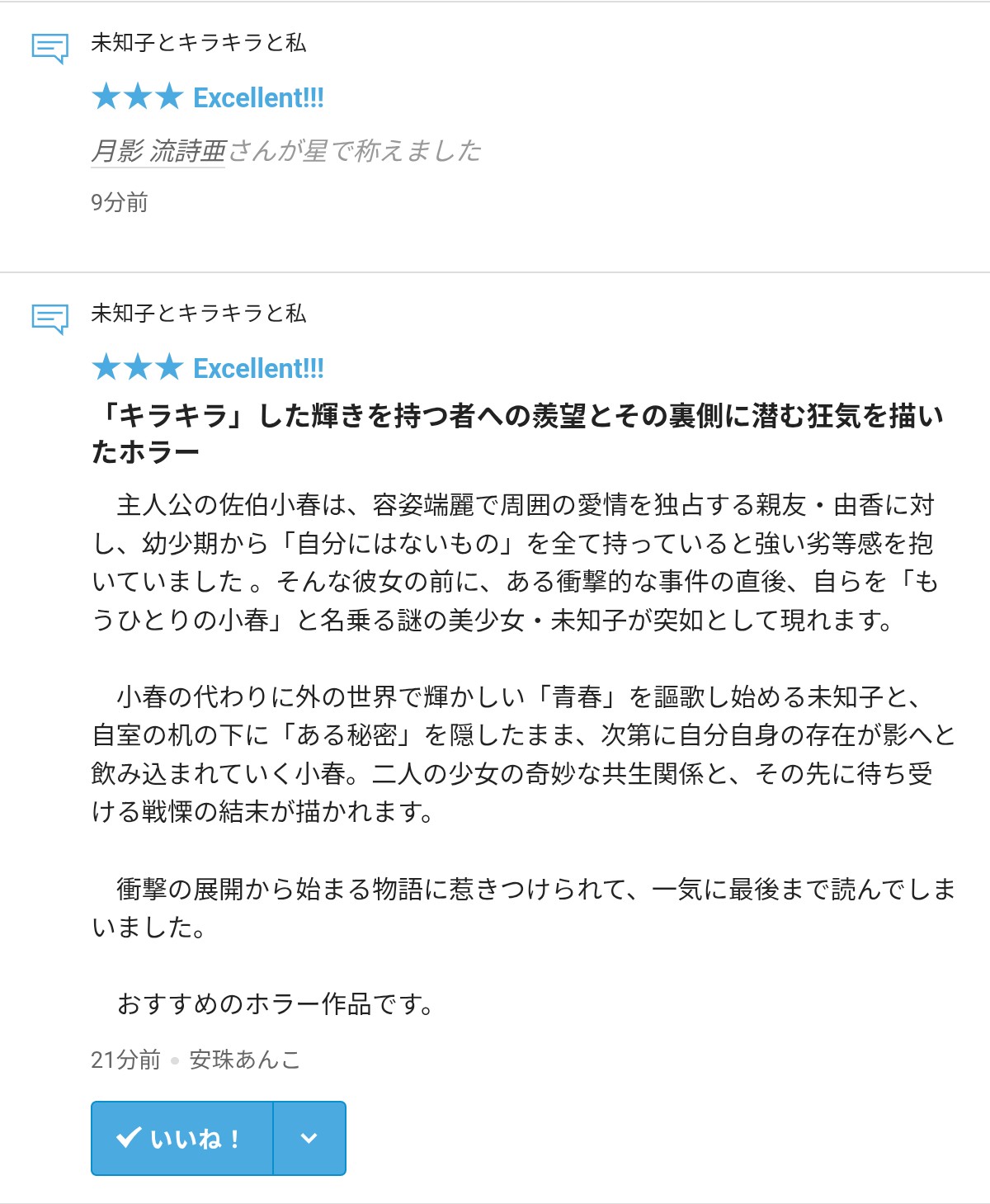 さて、拙作「未知子とキラキラと私」に☆・レビューをいただきましたので、お礼の報告をさせていただきます。
