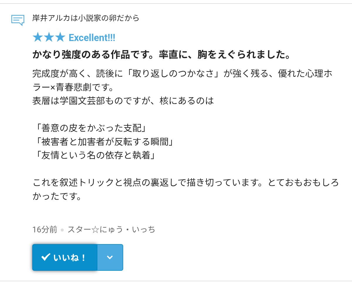 さて、拙作「岸井アルカは小説家の卵だから」に☆・レビューをいただきましたので、お礼の報告をさせていただきます。