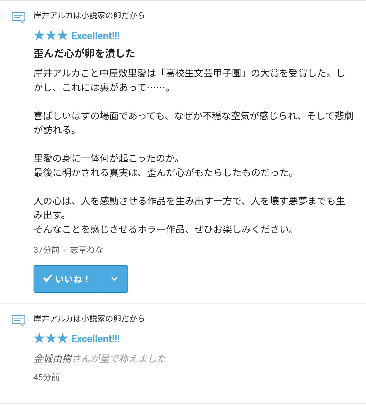 さて、拙作「岸井アルカは小説家の卵だから」に☆・レビューをいただきましたので、お礼の報告をさせていただきます。