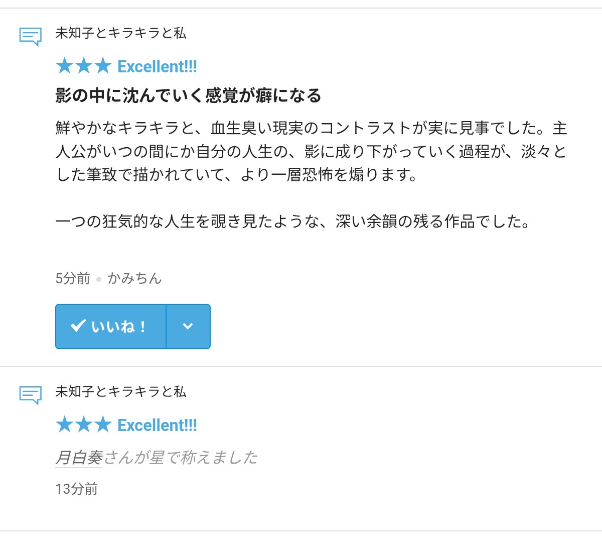さて、拙作「未知子とキラキラと私」に☆・レビューをいただきましたので、お礼の報告をさせていただきます。