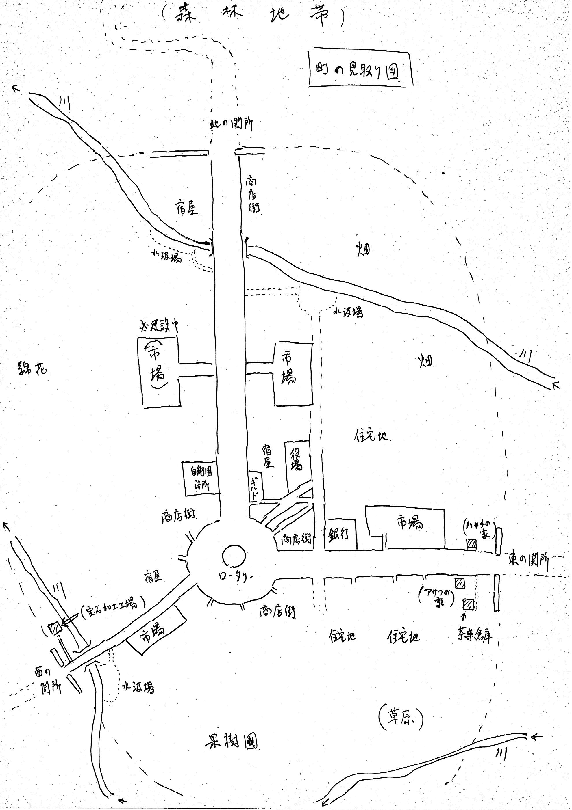 これは「(同)」のウラ話にも出てくるのですが、舞台となる町の、簡単な地図風な絵です。