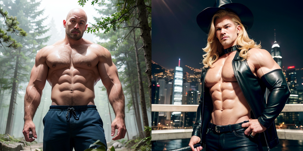 (右)「金髪の魔法使いの女の子と並んでポーズを取っているマッチョ」という指定をしたら、まさかの事態に。フュージョンしちゃいました。モチョダです。