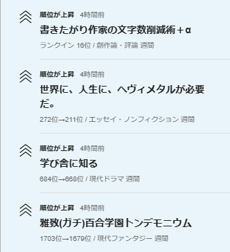 おかげさまで★250↑、❤コメント100↑、さらにはPVも自身初の10Kを達成できましたし、週間一位諸々も獲得できたので大満足です。あとは理屈でなく実践の方ですね。作家としての本分である小説で頑張っていければと思います。