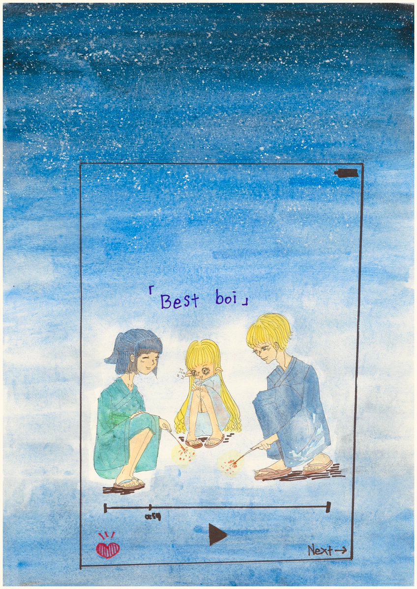 可愛らしい絵柄で、静かにふけていく夜と三人それぞれの心の動きが、はっきり見てとれるようです。三脚を使って動画撮影している設定ですが、スマホのフレームが描きこんであるところとか、なかなか芸が細かいですね!