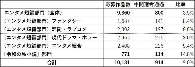 画像にあるように、エンタメ短編部門(全体)では応募作品数が9,360、中間選考通過が800、比率としては8.5%ほどになります。各サブジャンルも、だいたい同じくらいの割合です。