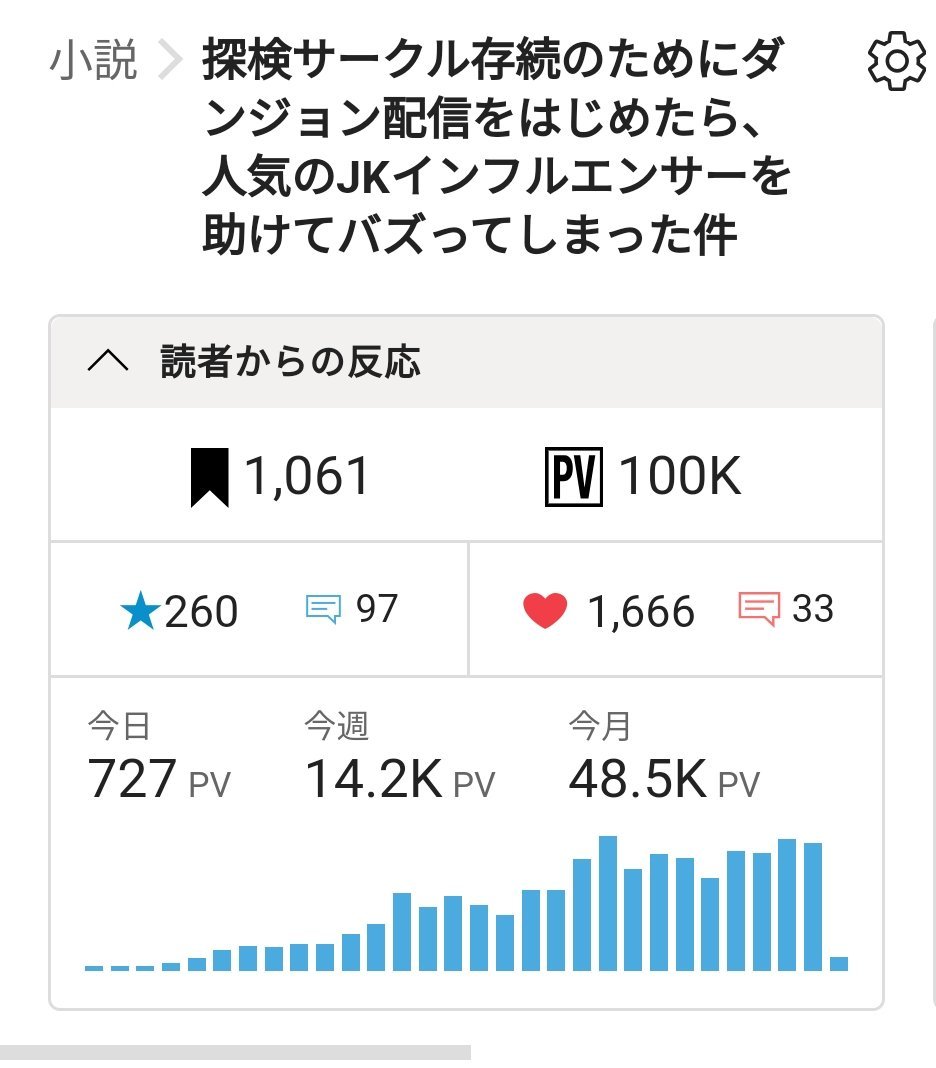 表題の通り『探検サークル存続のためにダンジョン配信をはじめたら、人気のJKインフルエンサーを助けてバズってしまった件』ですが、おかげ様で10万pv達成しました!