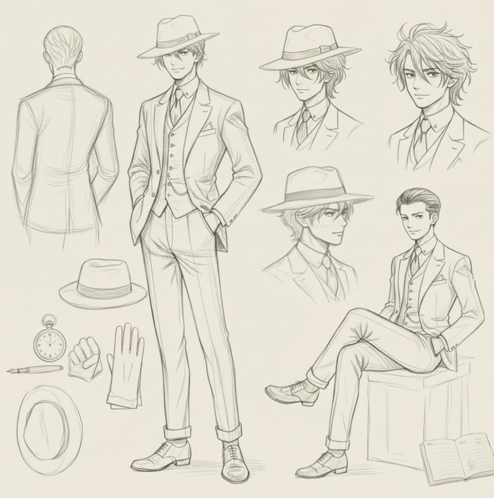 普段の髪はテキトーにして中折れ帽子かぶってる時と依頼人のところに出向く時の髪型きっちりしたオールバックスタイルに。髪色はカラー描く時確認するとして一旦暫定で。
