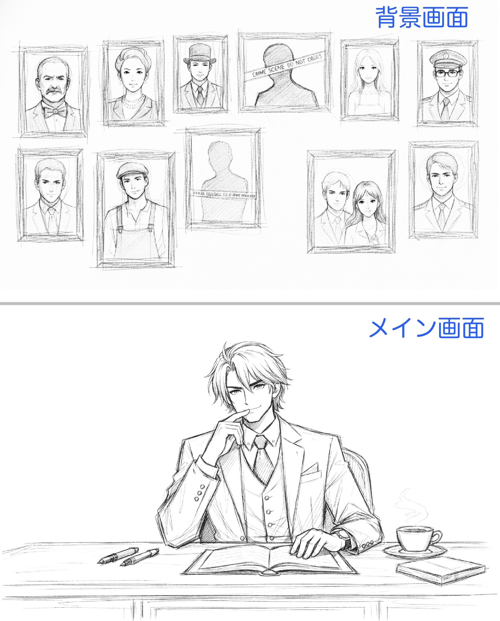 いい番最初の段階のレイヤー分けなので、「前景」と「後景」分けで、本番だとさらにレイヤー細かく分けて「机」「椅子」「人物」「机の小物」「各種背景の額縁」などにしておくと、例えば探偵さんのポーズ変えたい時や、額縁のポートレートの内容変えたい時、机の小物を追加したり、あるいは消したりする時、作業が、しやすいのです。