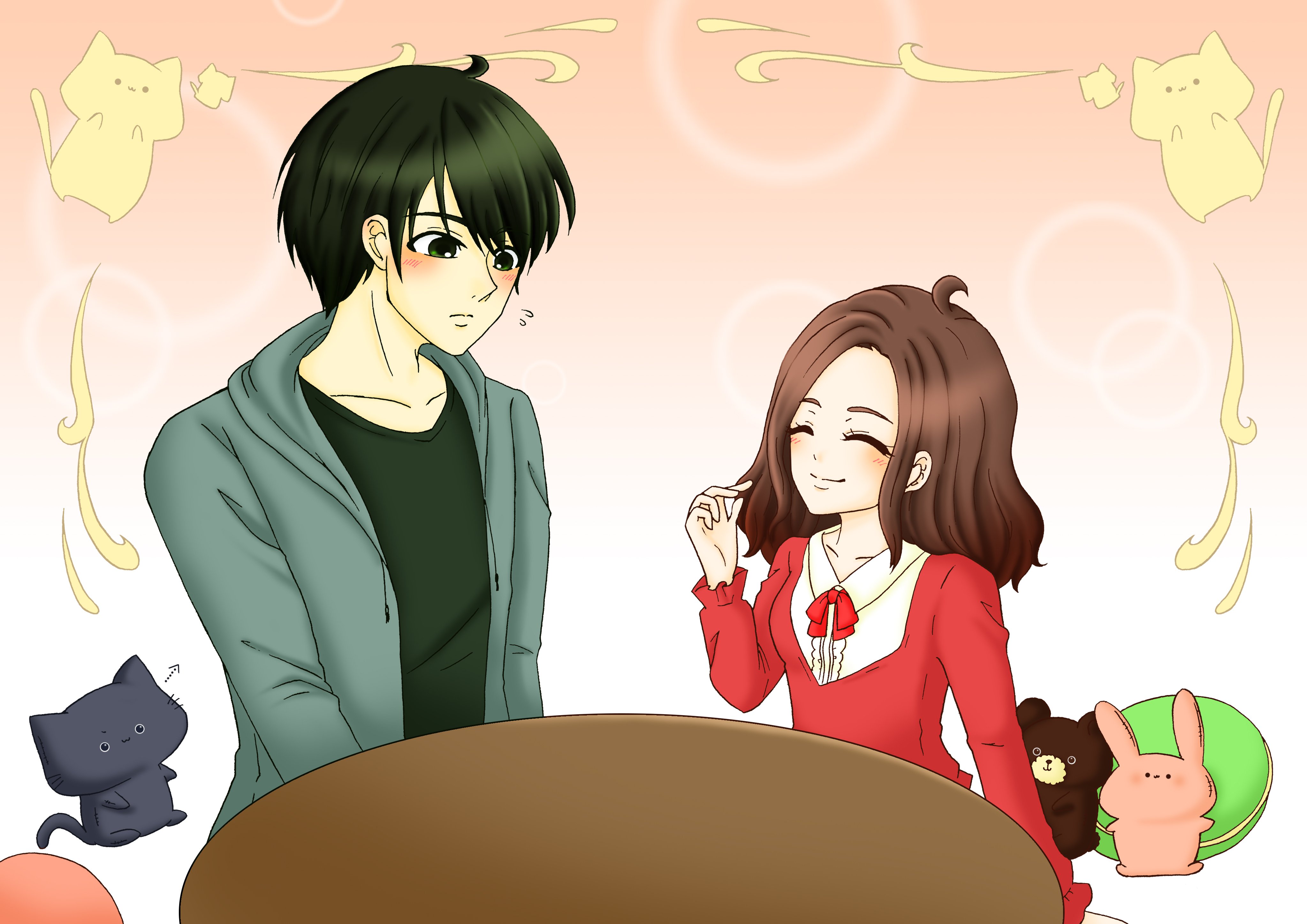 二人もさることながら、ぬいぐるみを描くのも楽しくて、作中にいた彼に視線を送るねこのぬいぐるみをはじめ、うさぎのぬいぐるみもかわいくてお気に入りです。