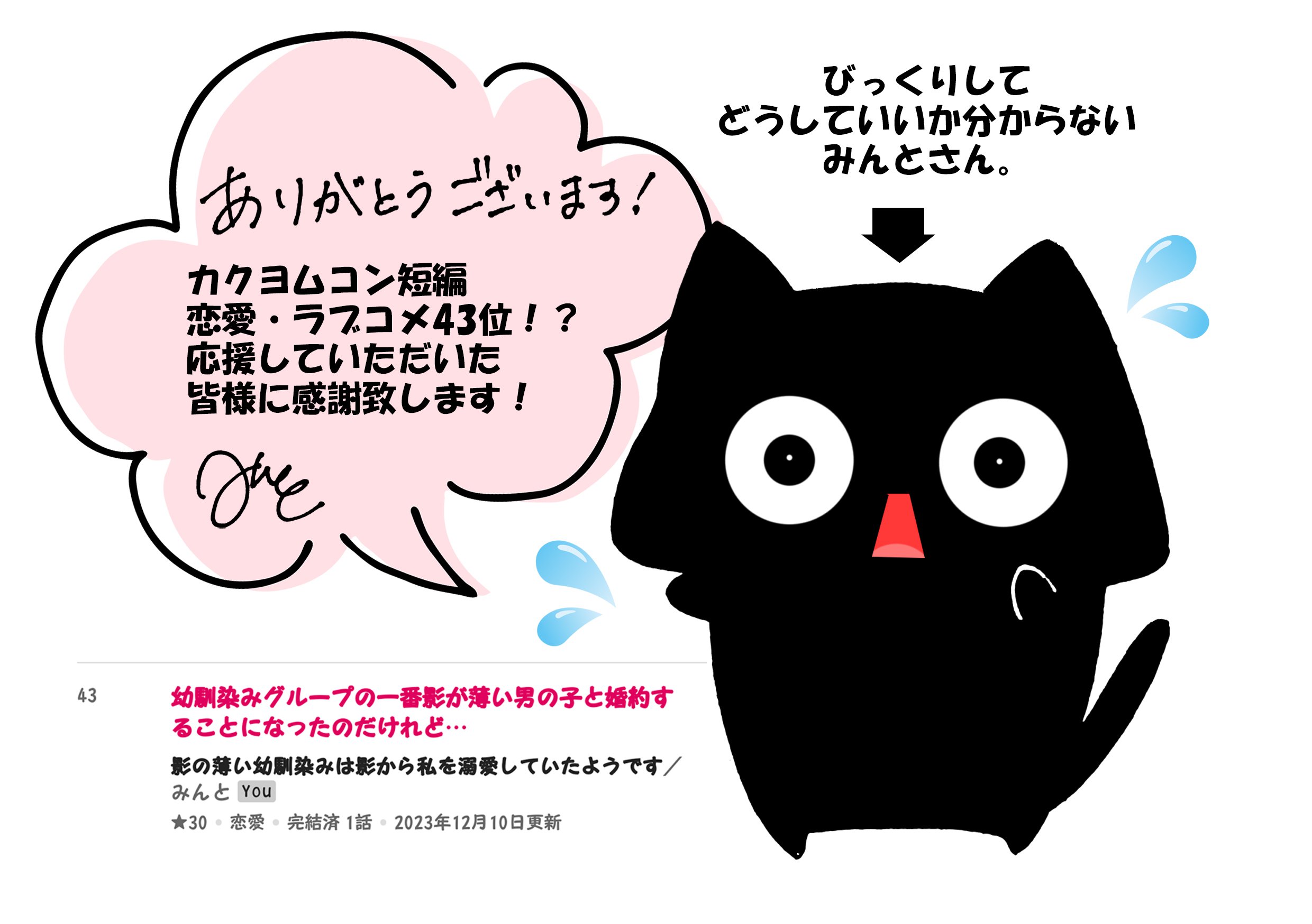 しかし、1回くらいは覗いてメンタルを鍛えようと思い、先程覗いてみたら、先週公開した読み切りの「影の薄い幼馴染みは影から私を溺愛していたようです」が短編の恋愛・ラブコメカテゴリで「43位」にいました。