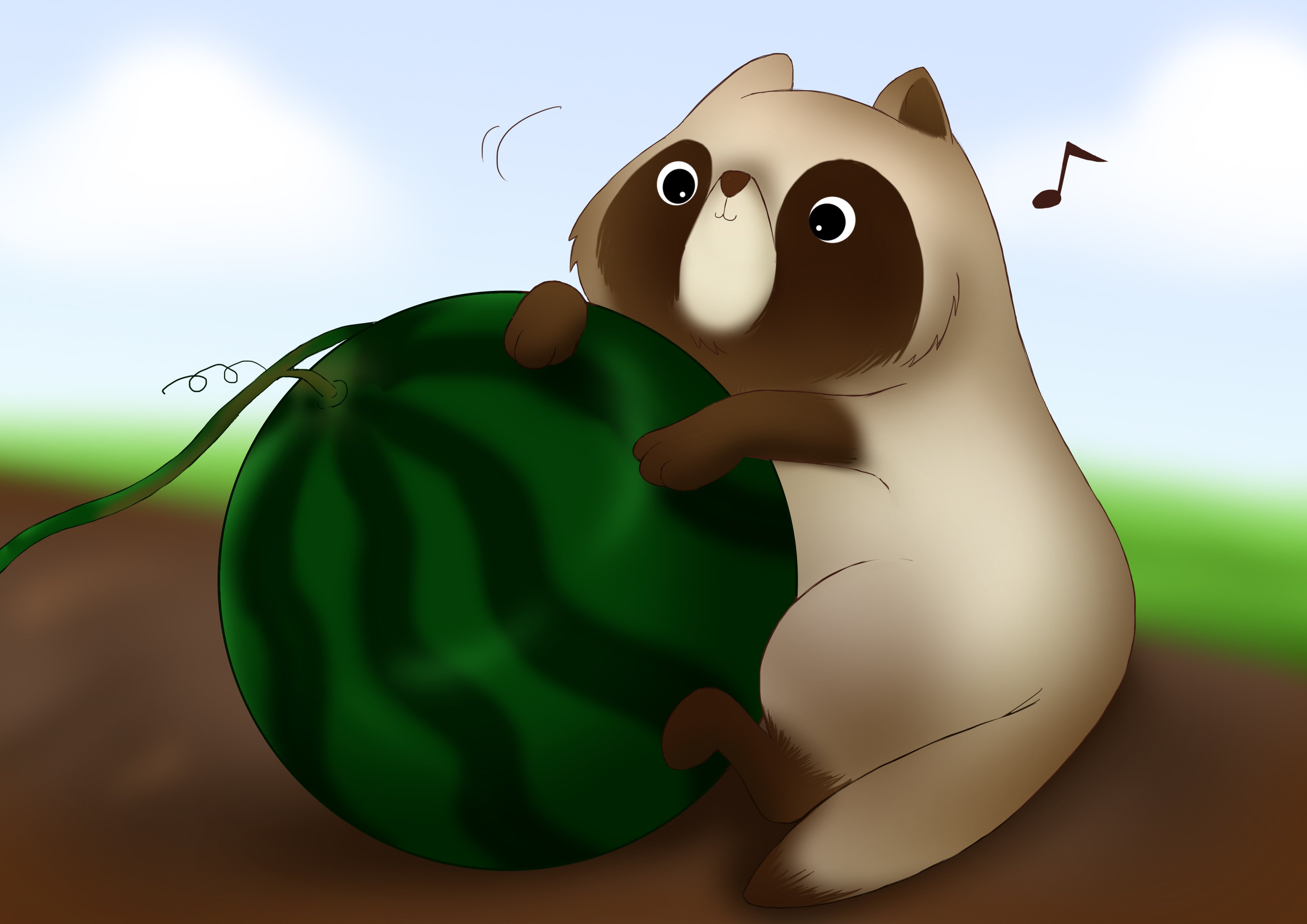 2枚目は、作中より、スイカを拝借しようと目論むたぬきさんです。