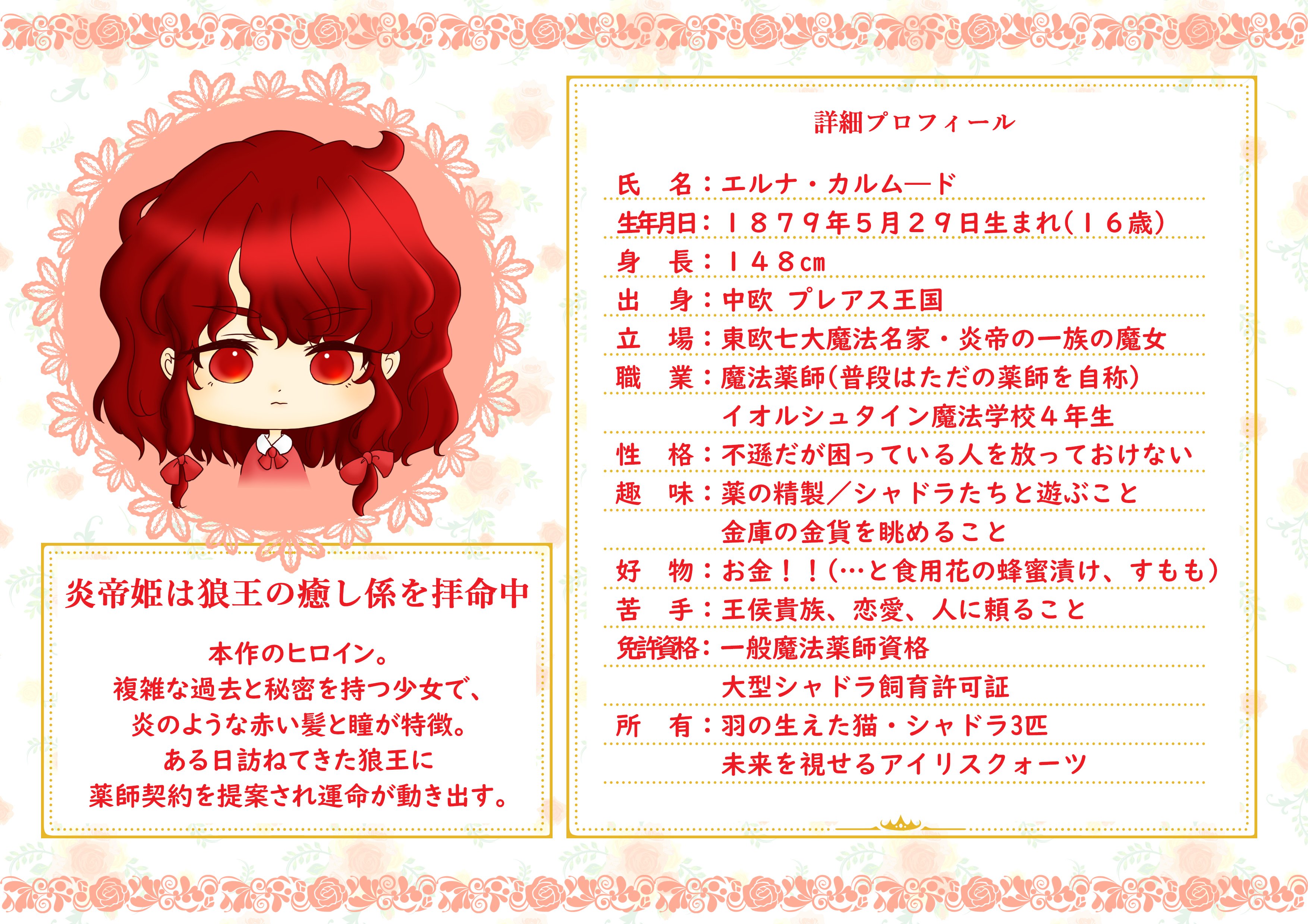 https://kakuyomu.jp/works/16818093090387065320そして今回は主人公エルナの詳細プロフィールイラストをお届け!