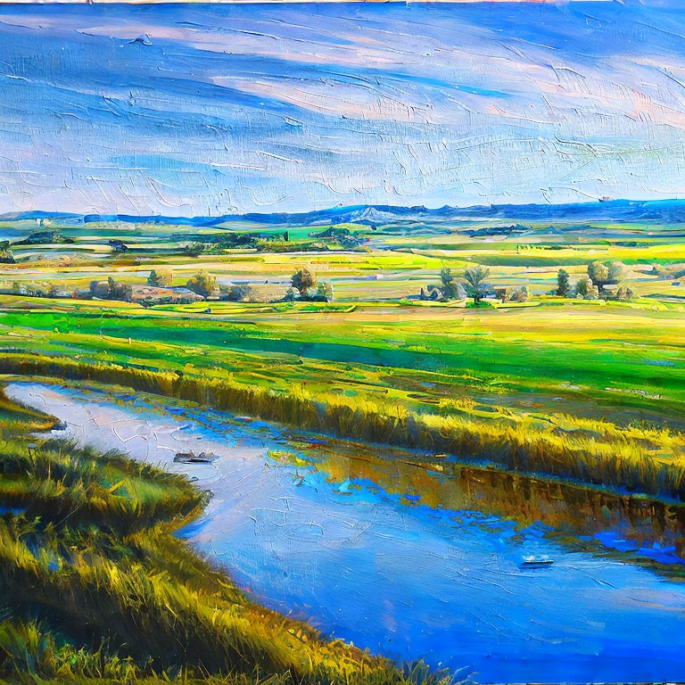 https://claude.ai/chats> A vast grassy plain under a bright blue sky with a small town surrounded by an intricate water gate system and a large artificial lake in the foreground, oil painting, irrigated farmlands stretching into the distance, warm sunlight casting long shadows, highly detailed brushstrokes capturing the crisp reflections on the still water surface and the texture of the grassy fields.