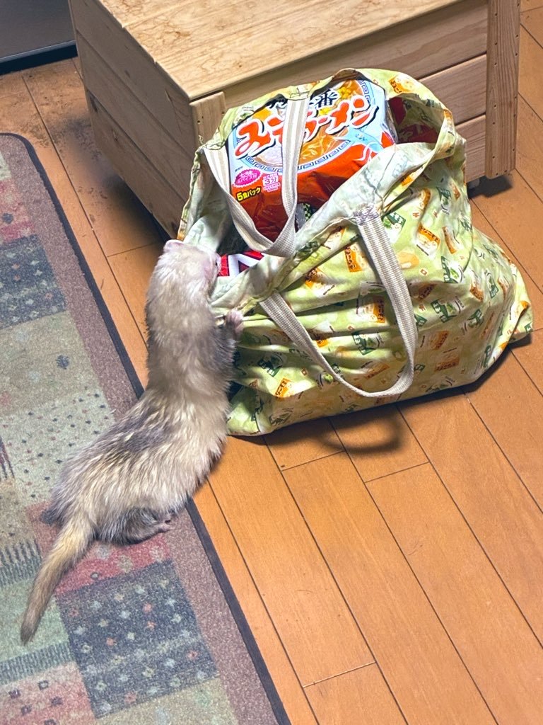 買い物から帰ると、西奈そっちのけで、エコバッグ(妻特製、チロルチョコ柄)に、すっ飛んできます。不思議と、まめたはこれ、やらないんですけどね。
