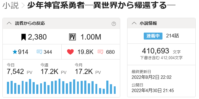 今が3ヶ月と少しだからこの倍ぐらいの期間は見向きもされなかったり「評価が悪くて辞める頃合いになるのか?」なんて投稿開始前には想定もしていたので皆様に見つけてもらえて、読んでいただけて本当に幸運なのだと思います