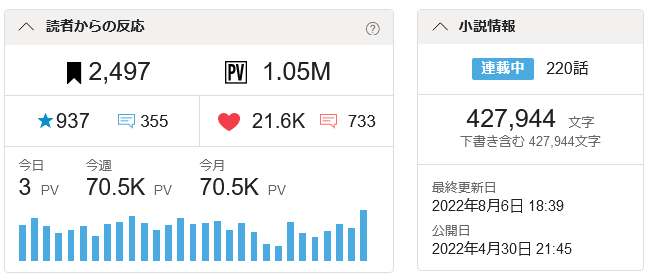 これまでに日間一桁も行けましたし週間ランキングも20~30位ぐらいをうろちょろしていましたが(最近不審に一気に下がりましたが・・・)ほんと投稿開始時には半年ぐらい「誰にも見られないかもな」って思っていたのも事実なので本当に嬉しいです!!