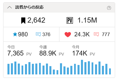 登録者2642人、PV数115万、★980、★投稿者数376、❤24398、コメント777