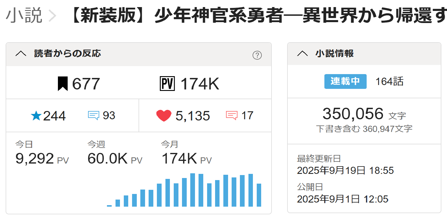 最近の近況ですが、最初の作品である『少年神官系勇者―異世界から帰還する―』を更新しまくっています。今月からの投稿ですが、現在163話……これ、毎日地道に書き直しています。