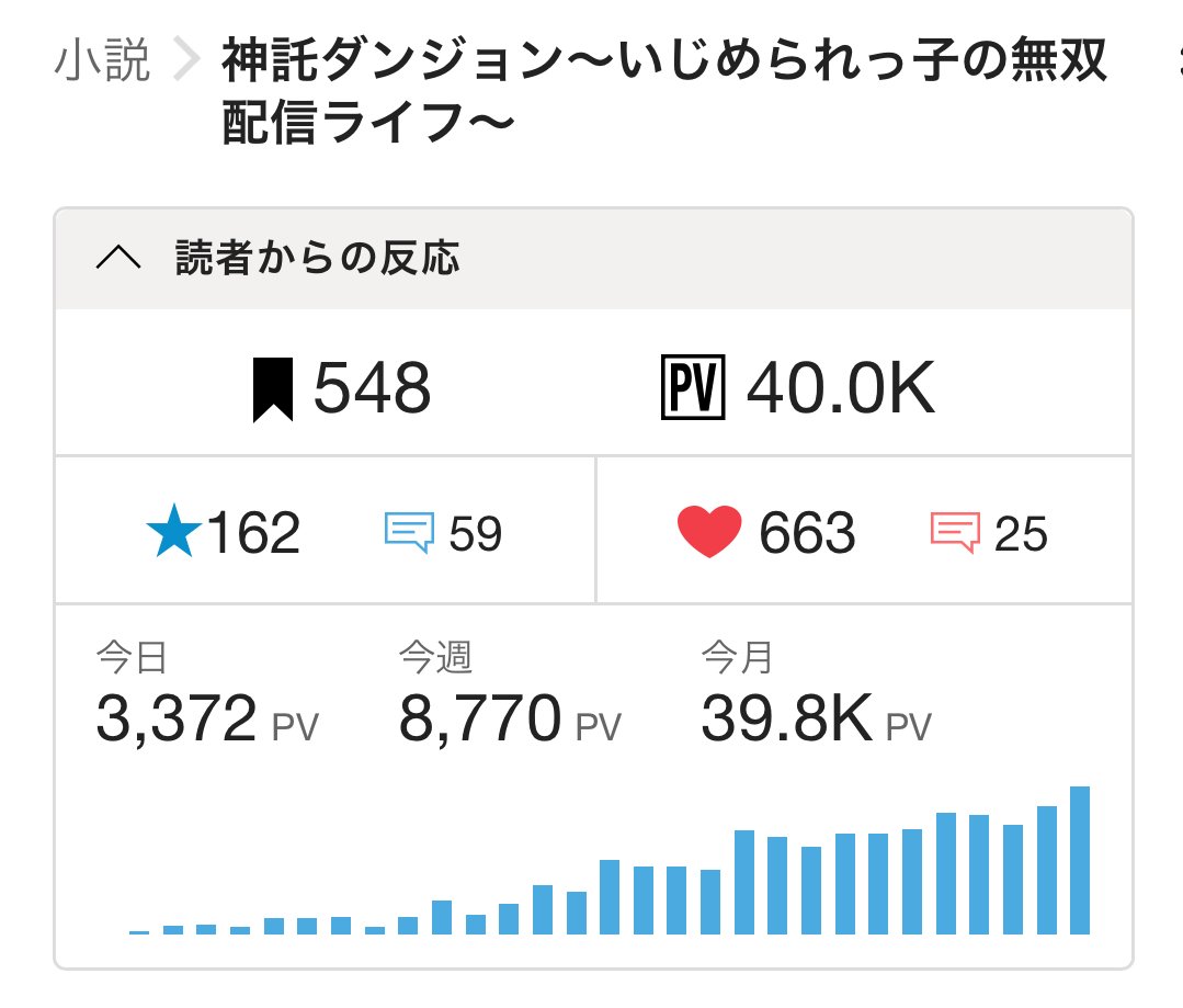 グラフで見ても最低からじわじわとPVが増えてく底辺作家らしい道のりがみてとれて、感慨深いです(まだ終わってない)