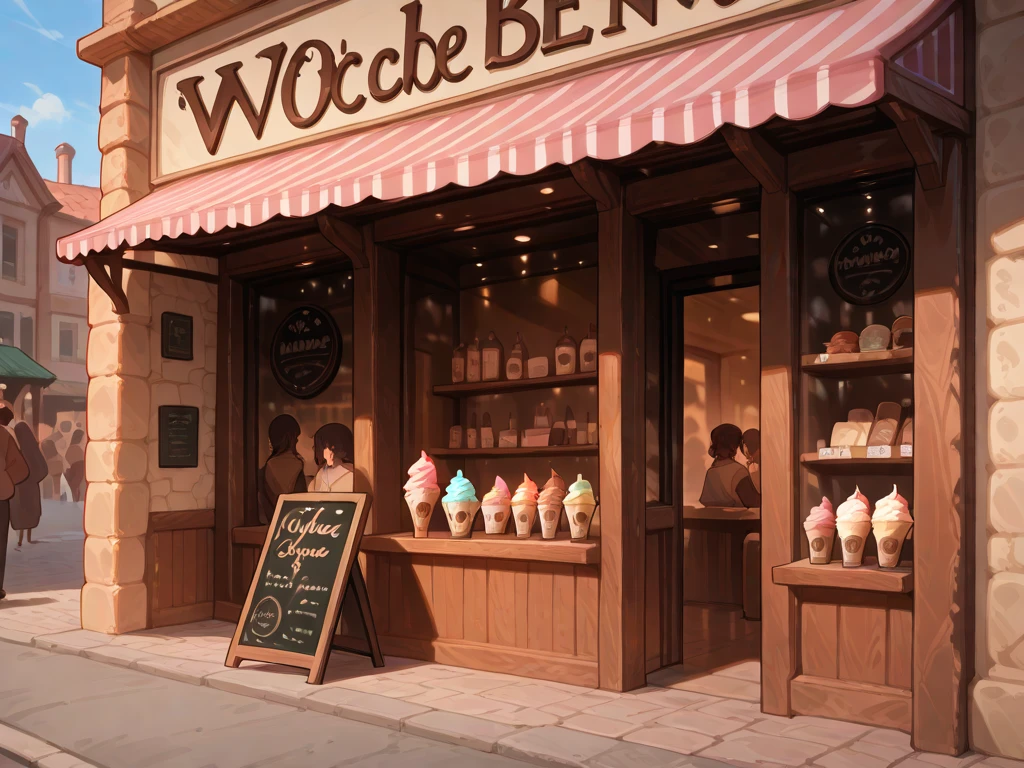 見える人に女が多い。近代的じゃなく、西洋風の街の様子。道路から見ると、アイスクリーム屋が向こうに見える。青空席がある喫茶店が近くに見える。