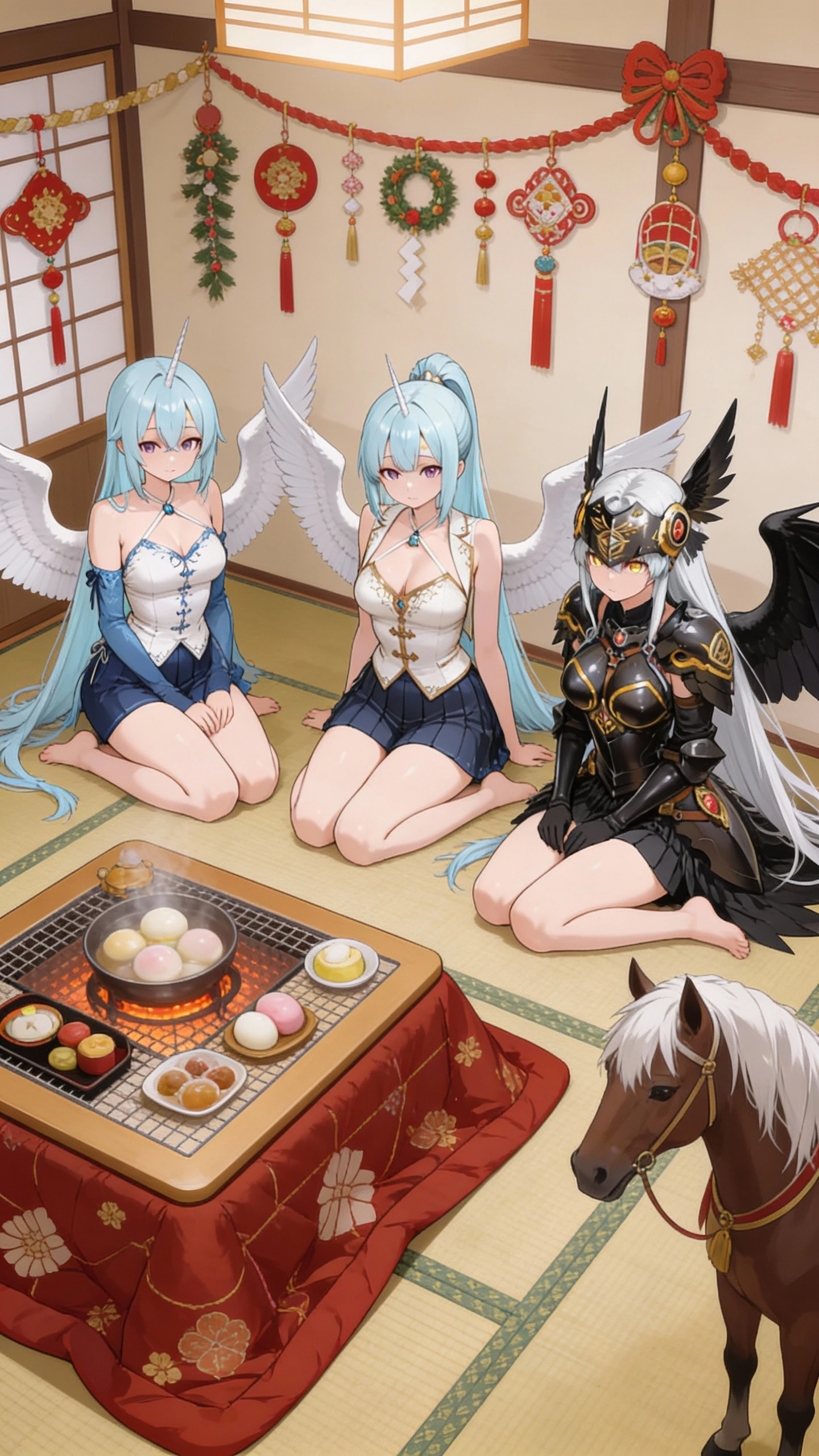 絵はエルファーネ=ストラード=ブレイユとユイリーナ=シエル=ブレイユとブラックヴァルキリー・カーラ。餅が焼けるまで我慢中。