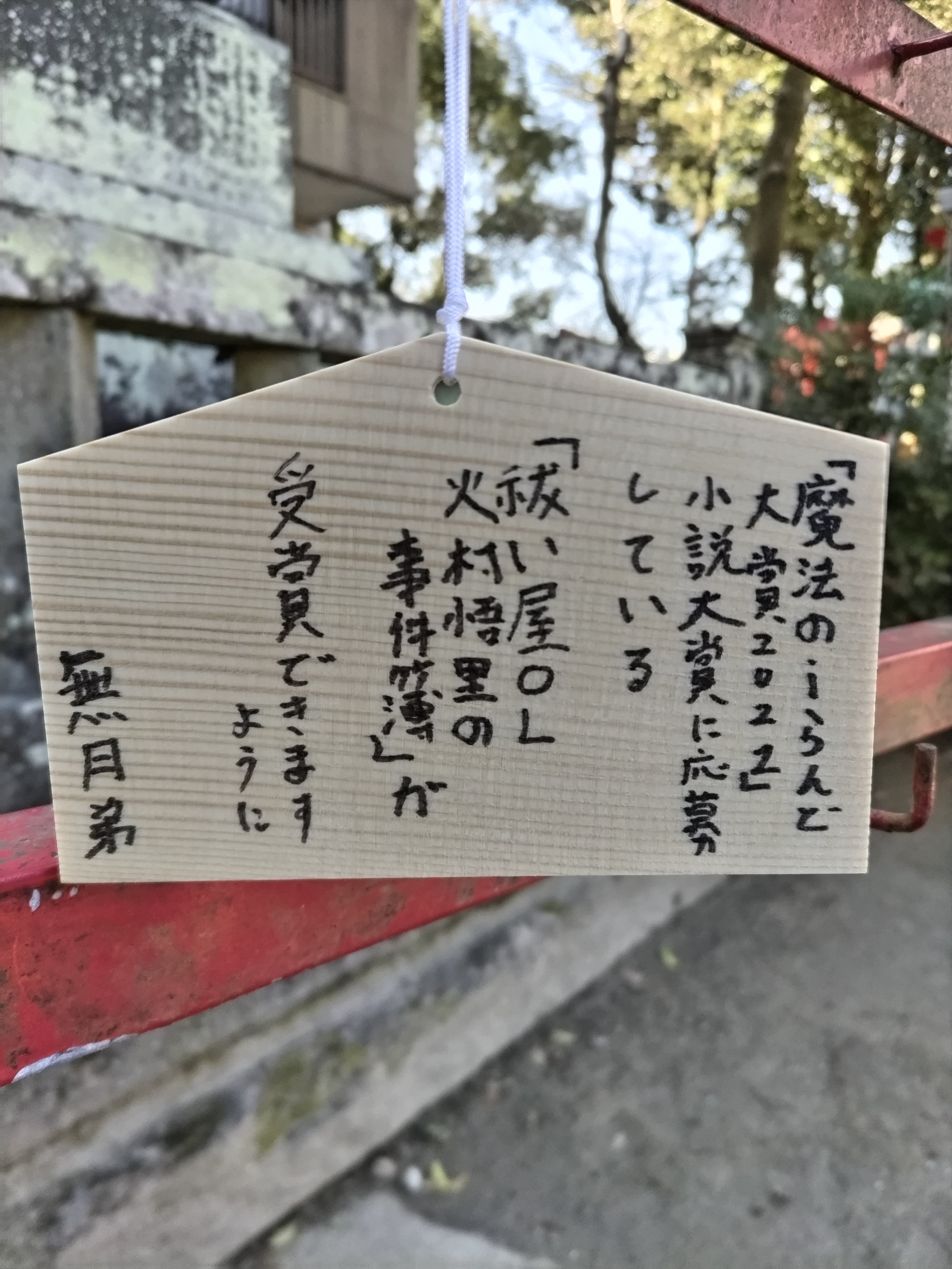 なのでカクヨムで言うことではないかもしれませんが、今度は魔法のiらんどのコンテストに参加中の『祓い屋OL 火村悟里の事件簿』が受賞できるよう、絵馬を書いてきました。